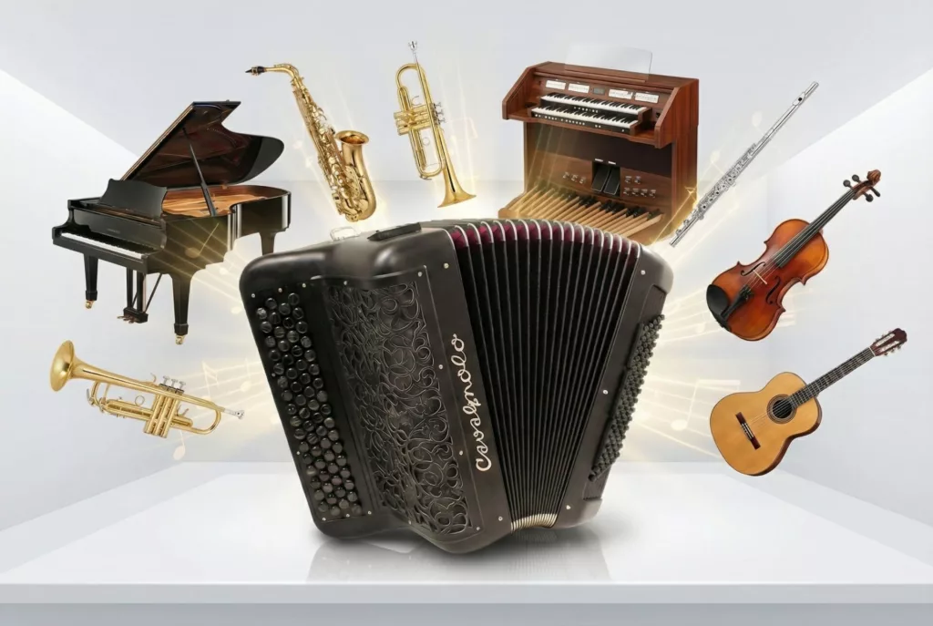 Votre Digit AiR Pro est conçu pour grandir avec vous. Des mises à jour régulières optimisent ses performances, et si vous souhaitez aller plus loin, il peut évoluer vers le Digit AiR Millenium. En usine, votre accordéon est transformé, intégrant de nouveaux sons et toutes les exclusivités du Millenium. Le Digit AiR Pro n’est pas un simple MIDI : c’est un compagnon sur le long terme. Plus besoin de revendre pour suivre l’innovation, Cavagnolo a pensé à tout pour vous.
